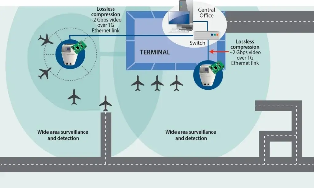 Advanced perimeter security systems, such as infrared 360° airport surveillance cameras, benefit from lossless compression by transmitting up to 2 Gbps of video over standard 1 Gbps Ethernet. This nearly doubles bandwidth efficiency, reduces infrastructure costs, and supports centralized monitoring with GigE Vision networking.